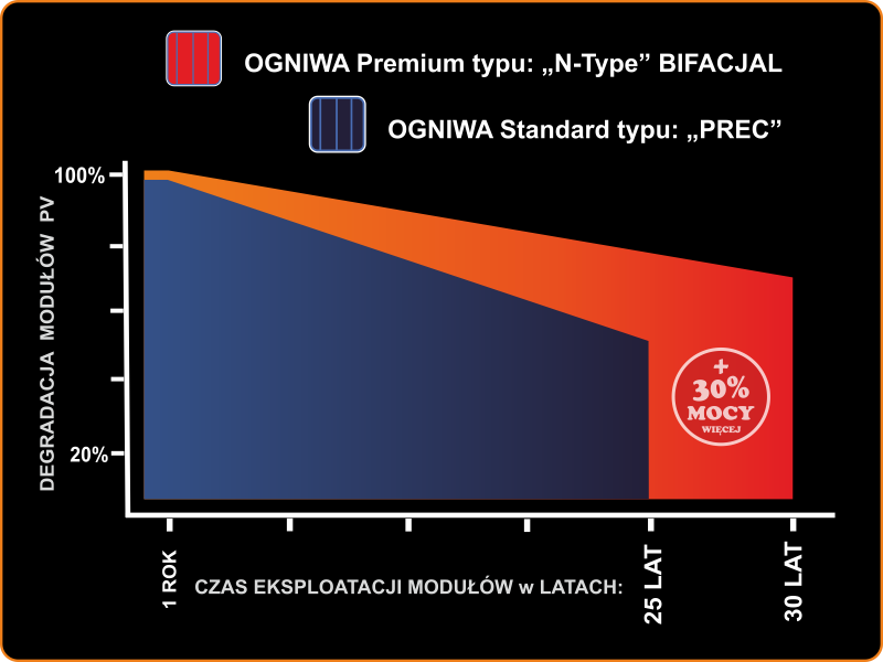 Nasze panele bifacjalne oferują nie tylko niezawodność, ale również spokój ducha z 30-letnią gwarancją. Odkryj wyjątkowość naszych paneli –