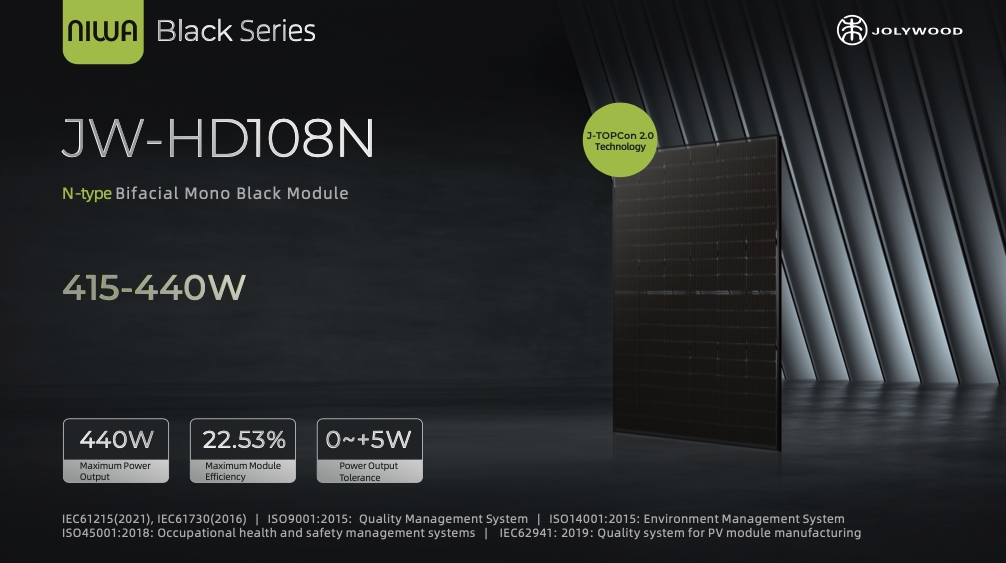 Panele Jolywood bifacial NIWA Full Black to wysokiej jakości moduły fotowoltaiczne, które łączą w sobie zalety technologii bifacialnej z eleganckim, całkowicie czarnym wyglądem. Są one idealne dla osób szukających efektywnych rozwiązań energetycznych, które jednocześnie doskonale komponują się z estetyką budynku.